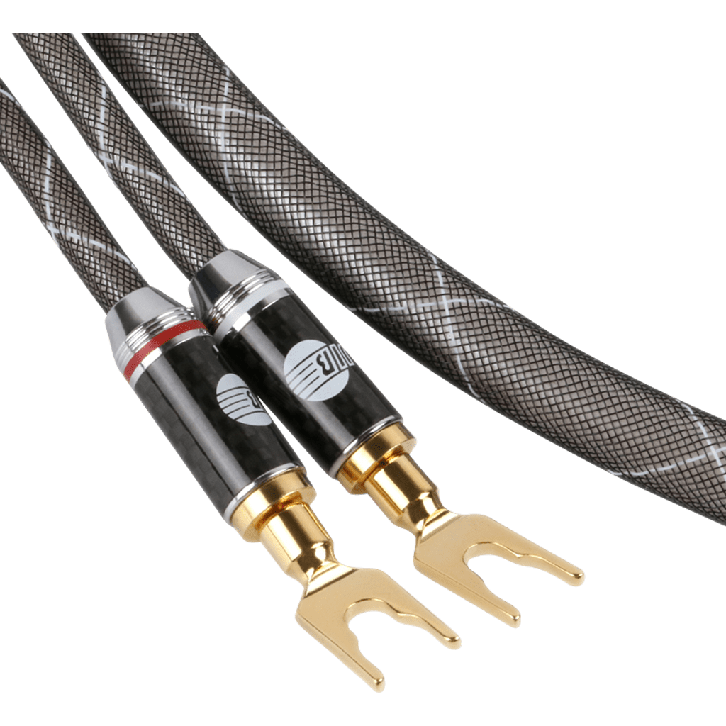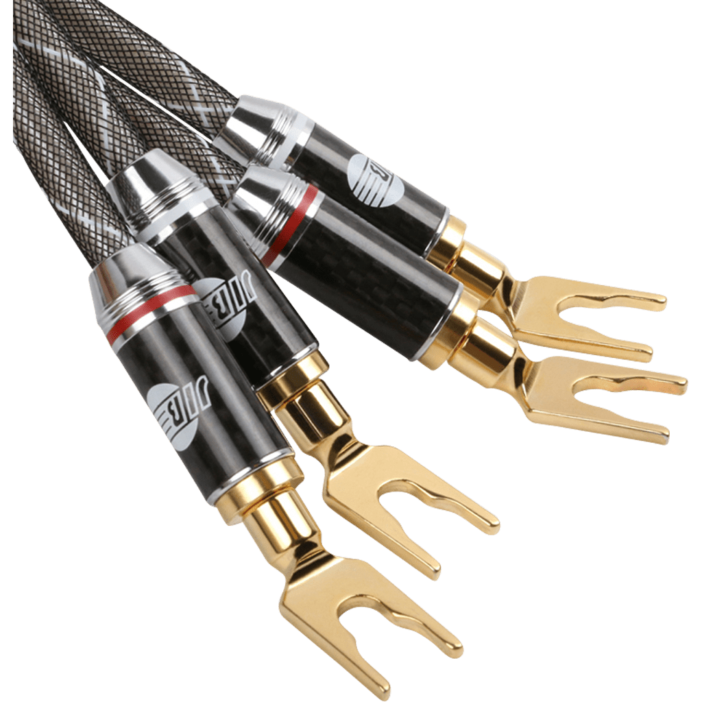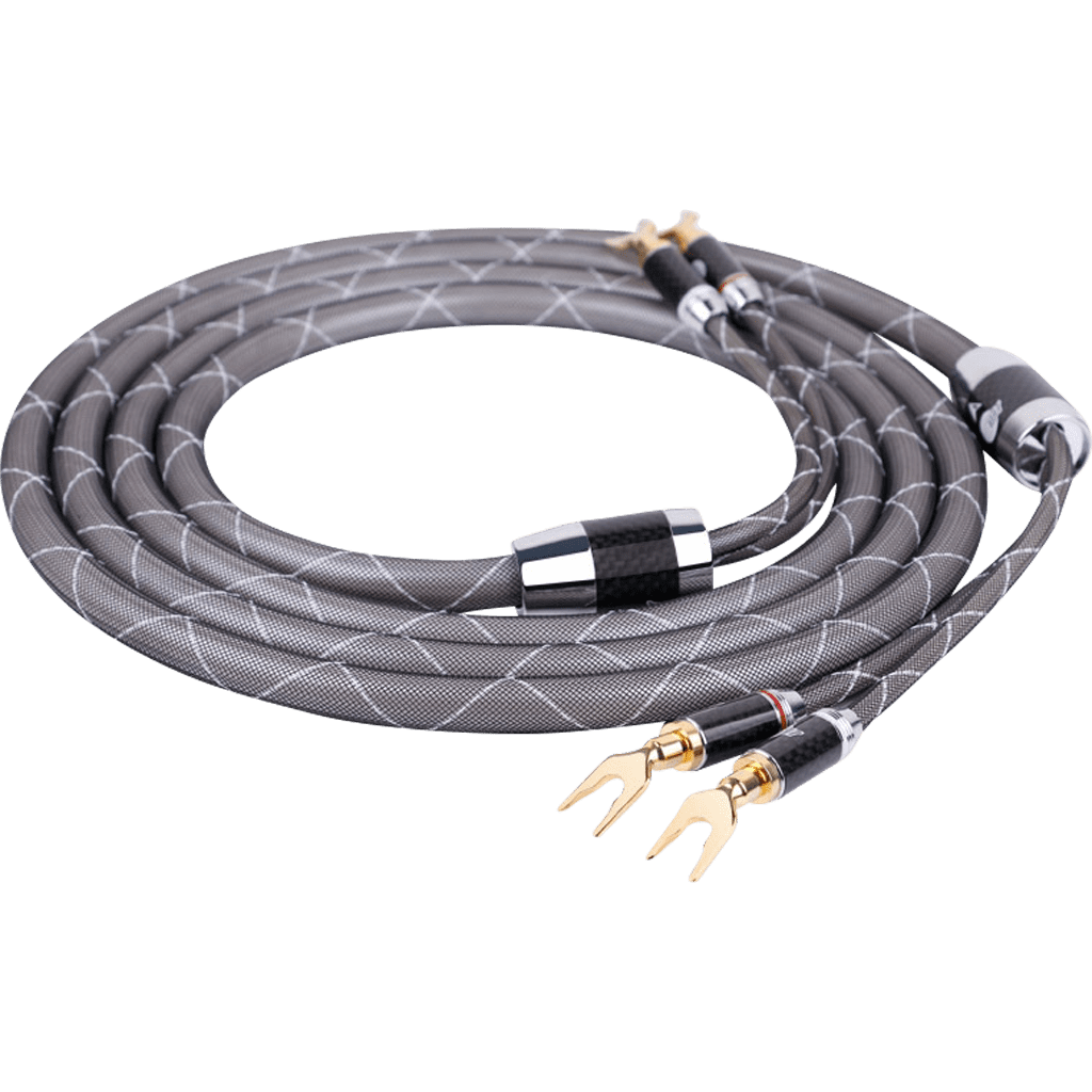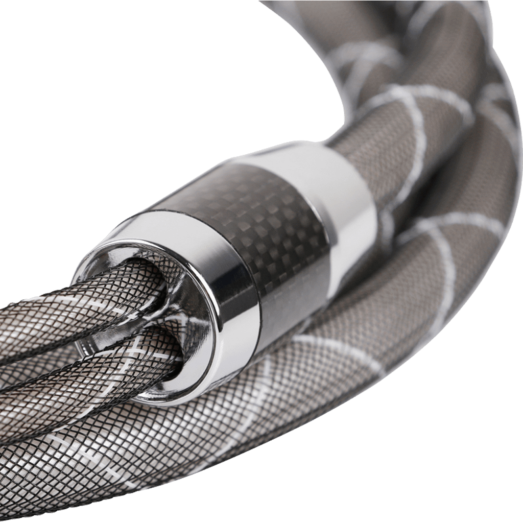 Das mit zwei Leitungsadern symmetrisch aufgebaute Lautsprecherkabel HF-004 verfügt über eine mehrlitzige und mit Baumwollgeflecht umhüllte Innenleiterstruktur mit je 2,0702 mm² Querschnitt, hergestellt aus hochwertigem Kupfer mit OCC® (Ohno Continuous Casting) Technologie und einer Materialreinheit von 99,9999%. Die Kontaktflächen der austauschbaren Gabel oder Banana-Stecker (beide Versionen im Lieferumfang enthalten) sind für eine verlustfreie Übertragung mit korrosionsbeständigem 24k Gold beschichtet.