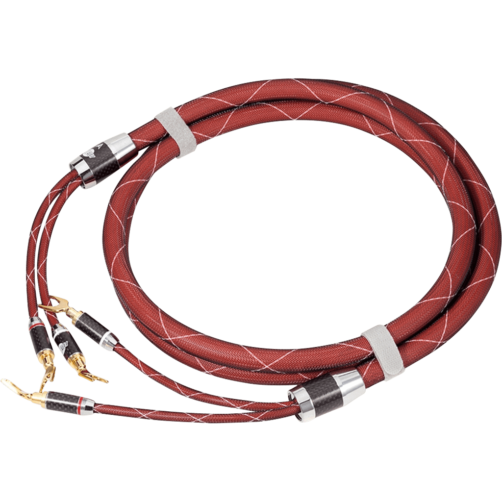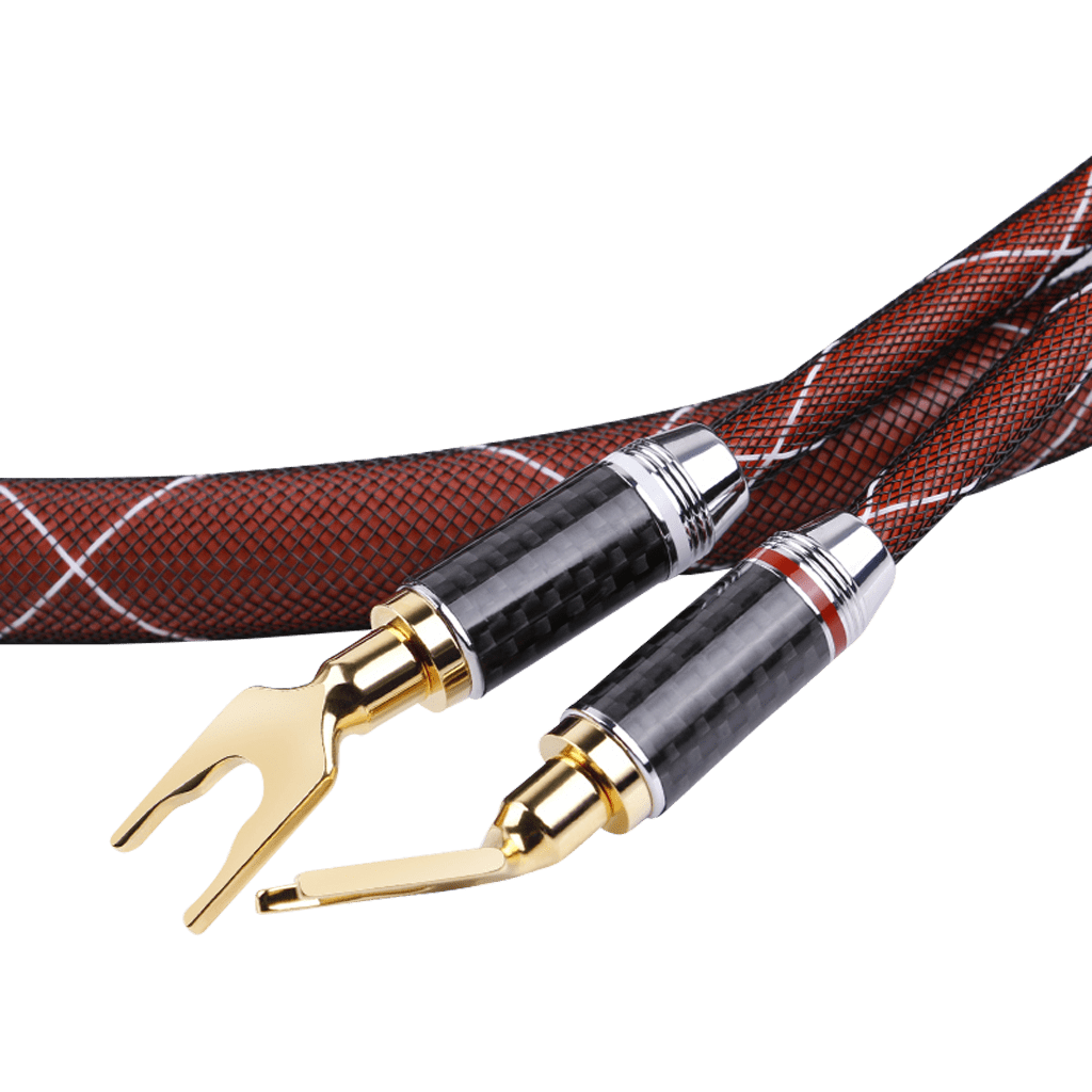 Das mit zwei Leitungsadern symmetrisch aufgebaute Lautsprecherkabel SB-004 verfügt über eine mehrlitzige und mit Baumwollgeflecht umhüllte Innenleiterstruktur mit je 2,075 mm² Querschnitt, hergestellt aus hochwertigem Kupfer mit OCC® (Ohno Continuous Casting) Technologie und einer Materialreinheit von 99,9999%. Die Kontaktflächen der austauschbaren Gabel oder Banana-Stecker (beide Versionen im Lieferumfang enthalten) sind für eine verlustfreie Übertragung mit korrosionsbeständigem 24k Gold beschichtet.